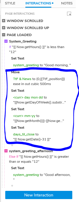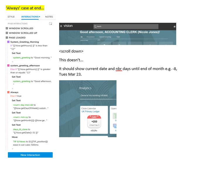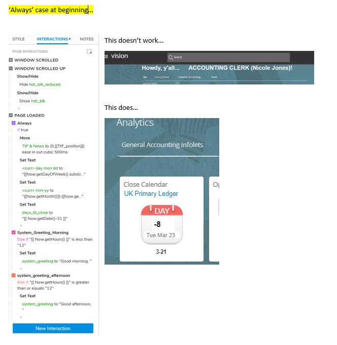 I want the page to greet the user depending on morning or afternoon. I’ve created cases based on [[ Now.getHours() ]] i.e. <12=‘Good morning’, >=12=‘Good afternoon’. The other Move and Set Text interactions have nothing to do with the greeting. I want them to be outside of the conditional cases.