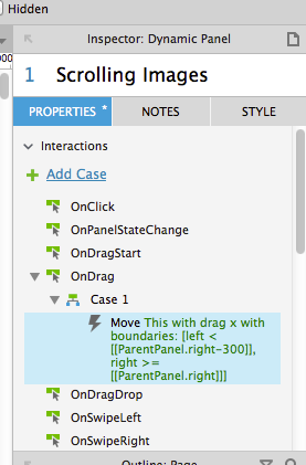 Alternatively, you can add an OnDrag case to the child panel and give it a “Move with Drag X” action so that it only moves horizontally when dragged. To limit how far it can be dragged (i.e. prevent the user from scrolling it beyond the boundaries of the parent panel), you can use the “Boundaries” properties on the “Move” action: