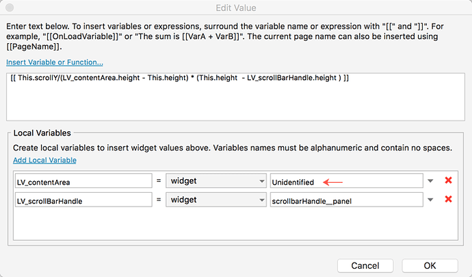 The reason the scrollbar isnât working is that a local variable in the OnScroll expression is pointing at an undefined widget. I still get caught by this.