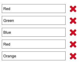 For example, the following list contains multiple items called ‘Red’. When clicking the delete button on either of them, I want both ‘Red’ rows to be deleted.