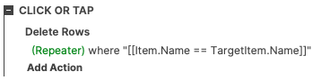 I’m trying to understand how to write a rule in the Delete Rows action will delete any rows in the repeater that have the same name as the row I clicked delete on.