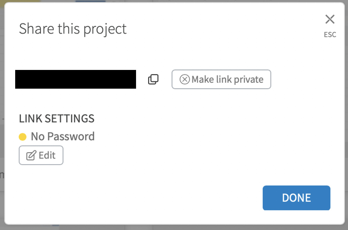 - Make your project link private: Toggle the button to ‘Make link private’ or ‘Make link public’