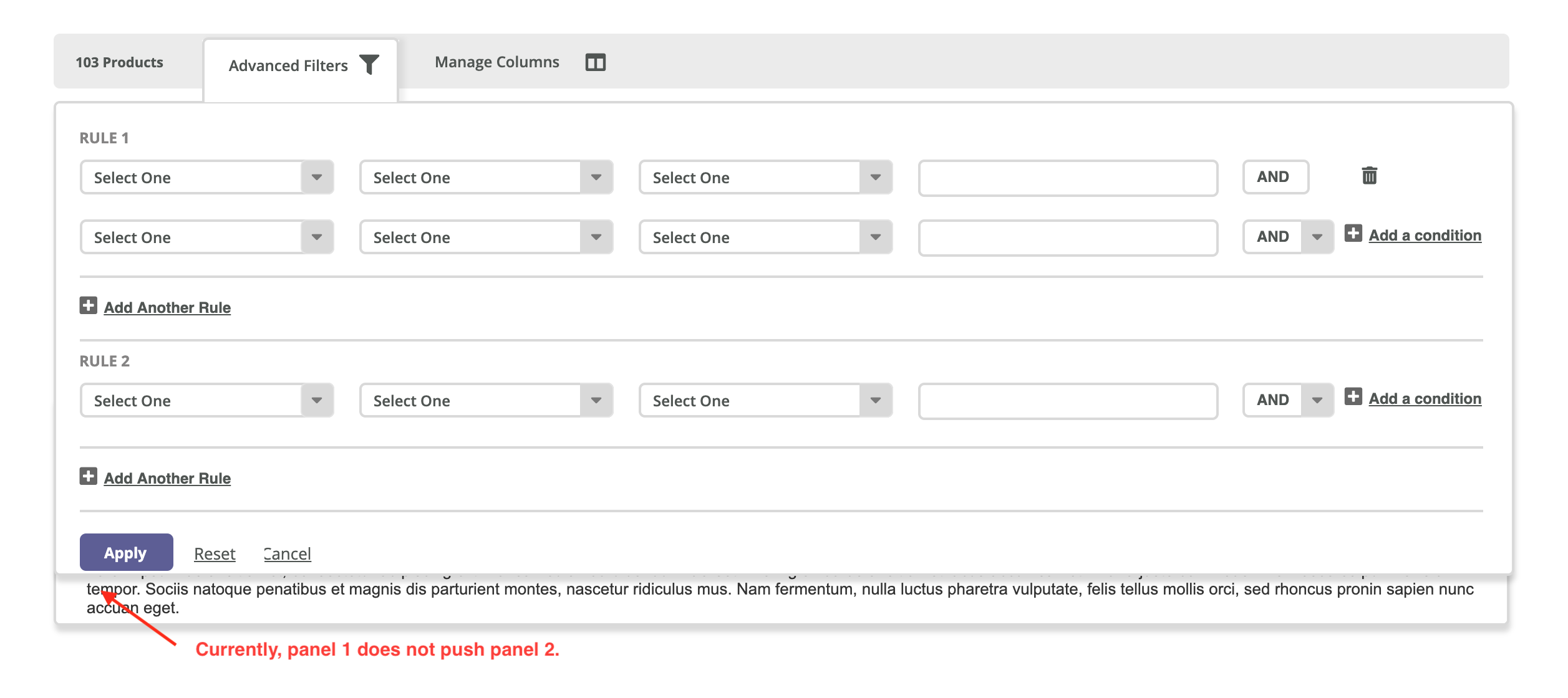 What I’m trying to accomplish - I have a section (panel 1 “Advanced Filters”) for which I’m currently using a dynamic panel. The user is creating rules and each rule can have multiple conditions. The panel only has one state and all widgets are pushing and pulling within that single state.