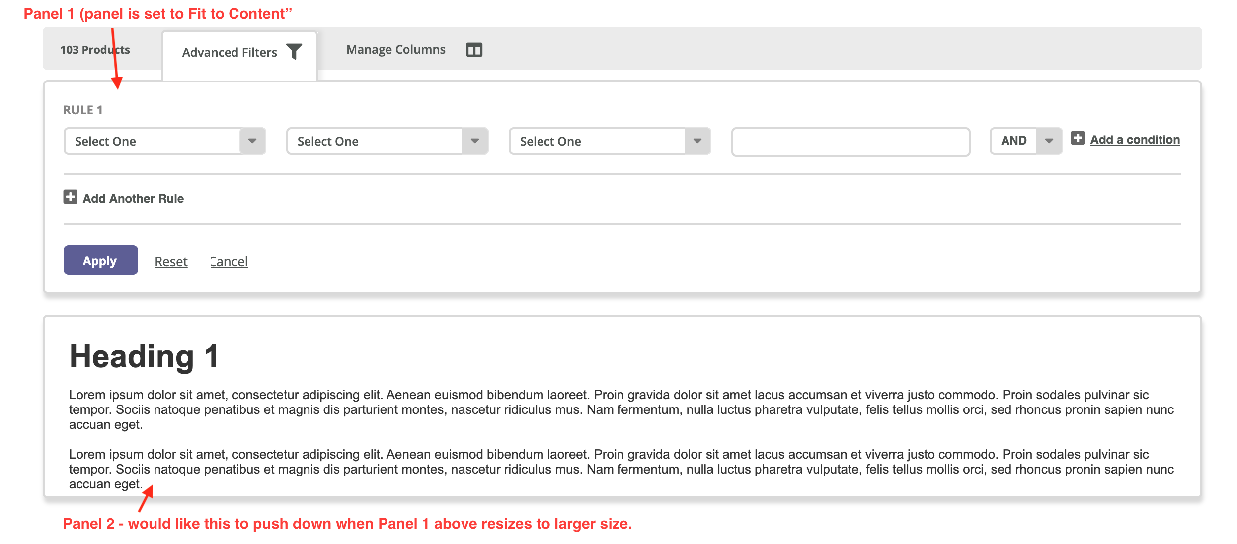 I’d like to be able to push panel 2 below it when panel 1 resizes. I can’t seem to get it to work. Any suggestions welcome.![47%20PM|690x303]
