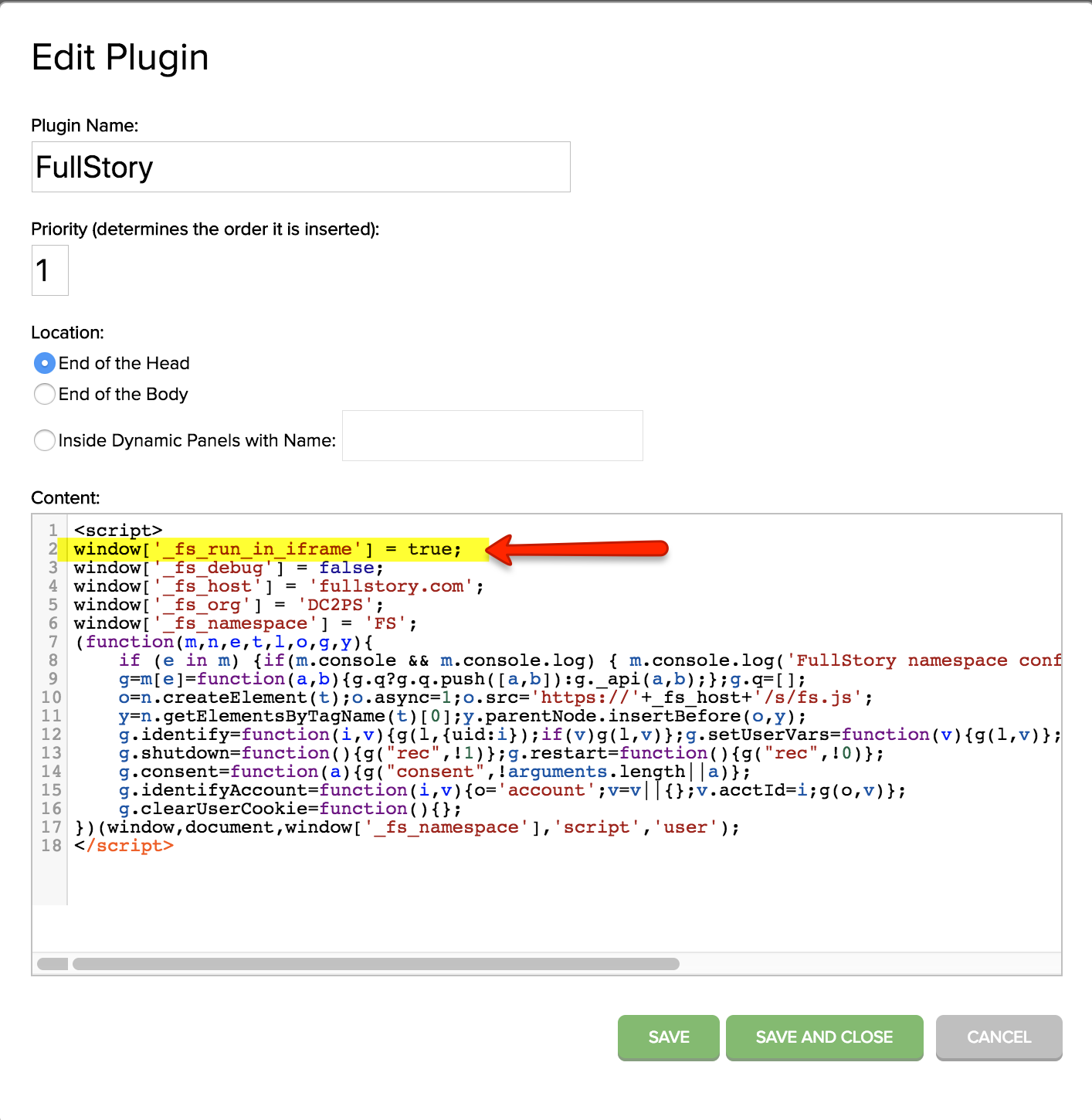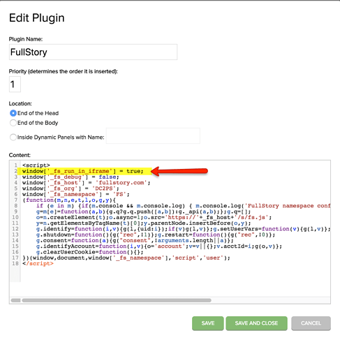 Further, I just tested adding a FullStory plugin to my Axure Share prototype, and it seemed to work when the HTML Sidebar was completely closed. When the HTML Sidebar was open or minimized, it didn’t work. I looked into this, and it looks like content in iframes for FullStory will need an extra line of code for it to work properly. If you need the prototype to work with the HTML sidebar open, minimized, or closed, you will want to add the following line of code to your plugin: