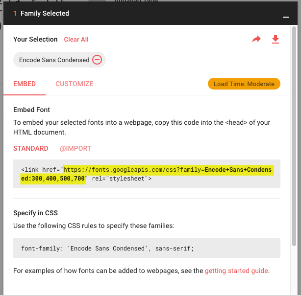 You would do that for Open Sans, Encode Sans, and Encode Sans Condensed to total 3 entries in the web fonts tab.