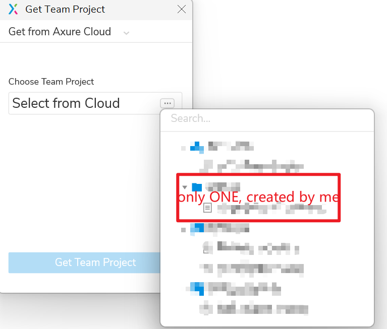 For those who are following along at home, caolei submitted their question to support@axure.com and our team identified the issue. The project in question turned out to not be a team project, which was why it wasn’t listed in the “Get Team Project” dialog. In Axure Cloud you can distinguish between regular RP files and team project files by the icons; team projects have a user icon with a “+” next to them: