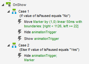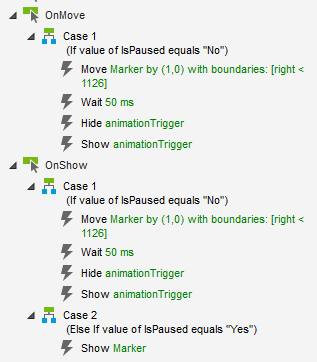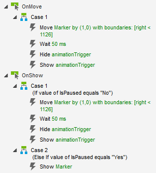 [li]The first problem was that I have set an animation for the move action of the marker - it caused the entire mockup to behave strange and start with delay. Once I removed the animation and added a “Wait” action it ran smoothly and with no delay[/li][li]In order to make both the initial “Run” button make the marker progress and also the “Resume” button do the same I had to place the interaction for the trigger on both “OnShow” and “OnHide”. Not sure if this is the most elegant way, but it works :)[/li][/ol]