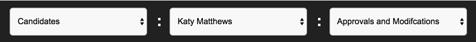 In the example above, I’d like to be able to “re-select” a parent level value (e.g. “Candidates” in the first menu). Going back to the breadcrumb analogy, imagine Candidates > Katy Matthews > Approvals and Modifications. I’d like to be able to click “Candidates” and be taken back to the Candidates page.