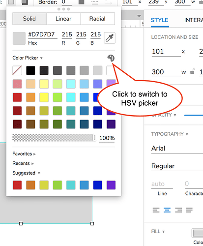 You can use the HSV picker to set the color on any type of widget. To switch between the color swatches and the HSV picker in the color selector, click the palette icon at the top right of the color selector: