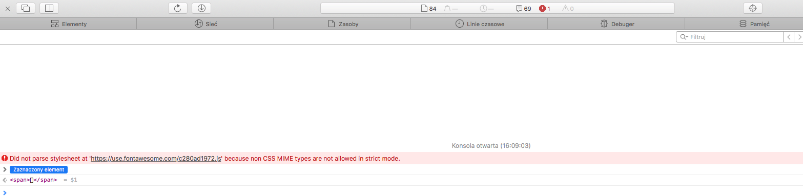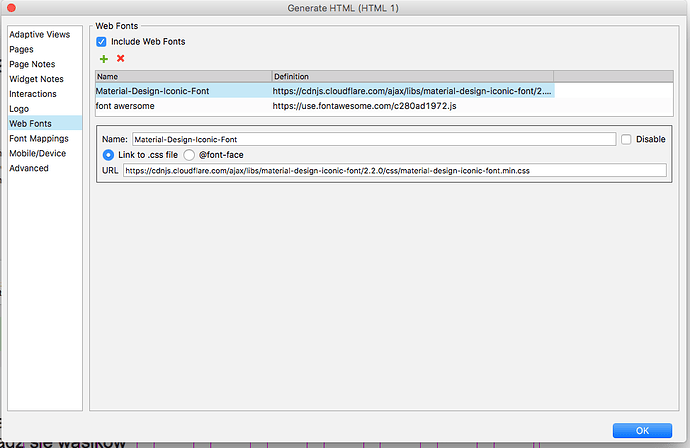 Regarding the console error, it looks like you may have put a .js link instead of a .css link in the web fonts tab for your Font Awesome font. Which version of Font Awesome are you currently using in your file? Is it 4.7? If so, and if your current fonts aren’t working, then please try using the assets from the link below to ensure that you have matching versions of the widget library, font file, and CSS link: