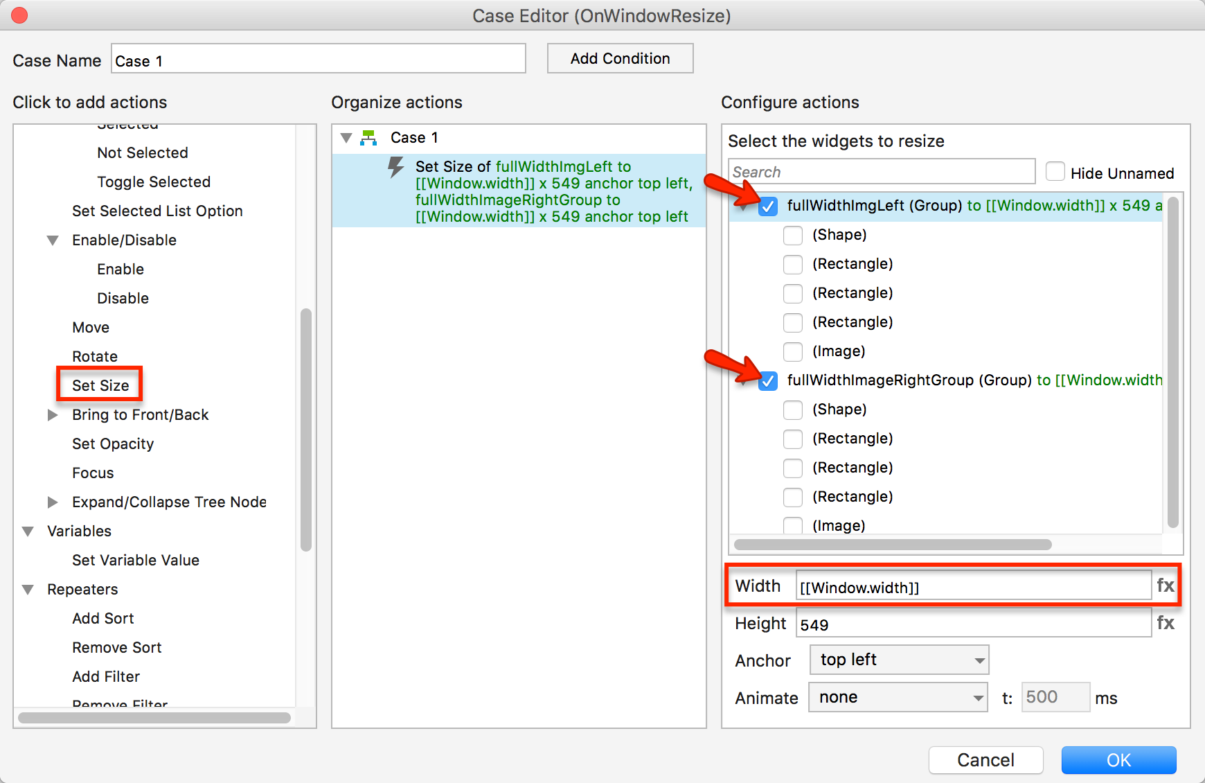 You can try using a “set size” action in the “OnWindowResize” page event to set the width of your groups to the variable value “[[Window.width]]”. The OnWindowResize event is triggered whenever the prototype’s page is loaded or resized and [[Window.width]] returns the current width of the window, so this would set the width of your groups to match the width of the window: