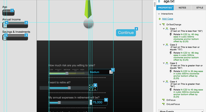 There’s a lot going on here so I’ll try to explain in as much detail as I can. When the user arrives, some defaults will be set based on the previous screen & the gauge will land somewhere based on this. When user moves the sliders around, the gauge should move logically. The first section, risk works fine. The second section, age (age.txt -image attached)dial.rp (506.7 KB)
