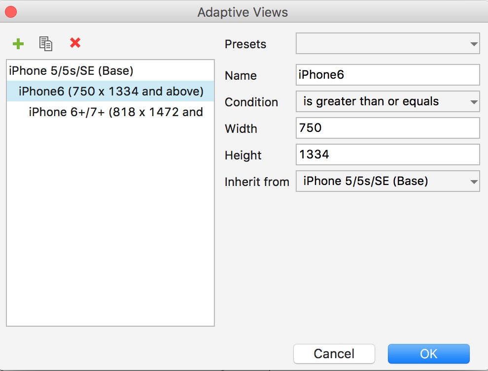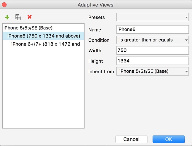 I’m trying to set up those adaptive Views for iPhone 5/5s/SE, iPhone 6/7. I’m really frustrated because my iPhone 6 doesn’t recognize the correct adaptive View from the iPhone 6/7 with the width: 750. Instead it displays the screen from the adaptive View iPhone 5 (640 width)
