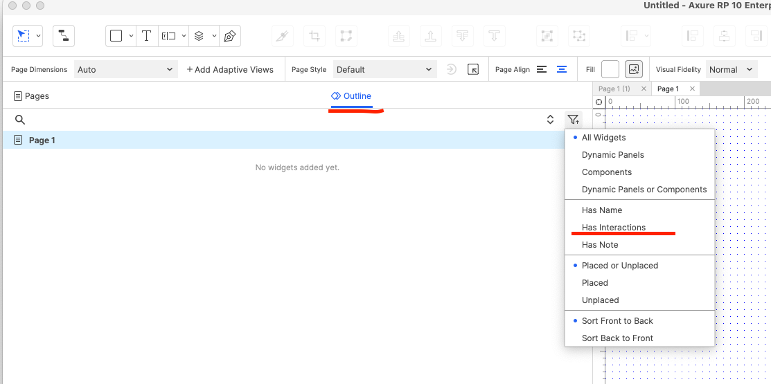As a workaround, you can go to the Outline Pane, select the filter icon, and in the menu, click on “Has Interactions”. This way, you’ll be able to see all widgets on the page that currently have interactions, and then you can select them one by one, go to the Interactions Pane, and delete them.