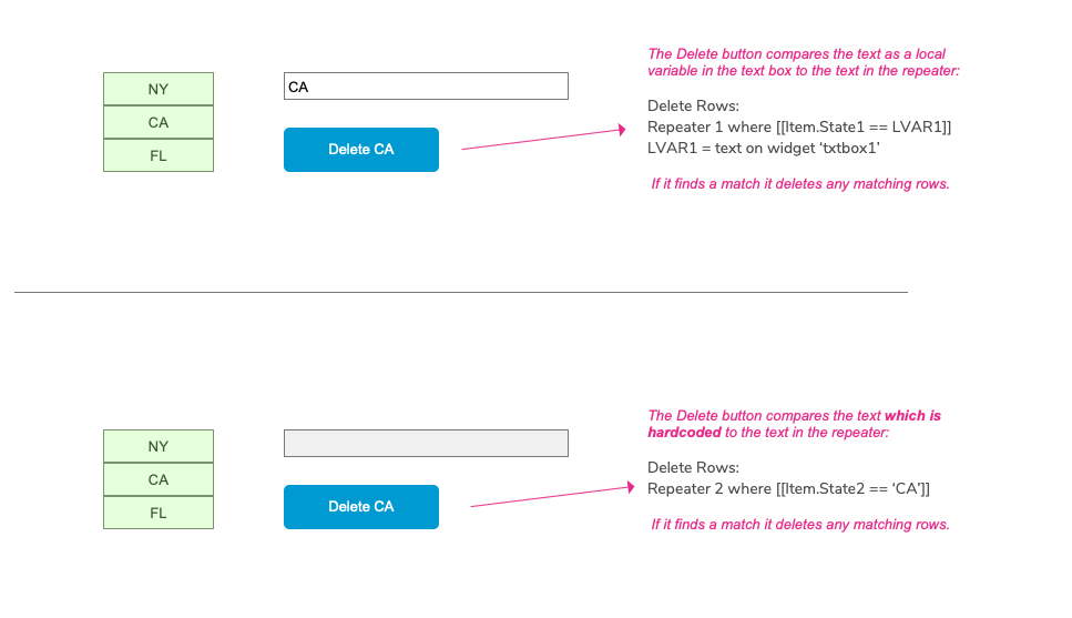 However, if I add a text box, and put the text CA in the text box, then ask the repeater to delete the row where item.state matches a local variable set to the text in the text box it works. This makes no sense right?