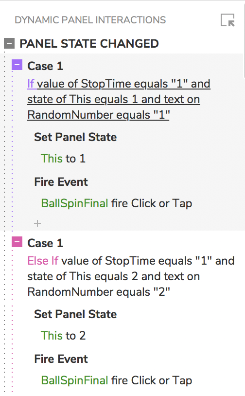The ball stops at its final location due to an interaction on the dynamic panel that is activated once the StopTime variable is set to 1. At that point the ball will continue to spin at 200 ms while the dynamic panel checks if the panel state and the random number are the same and if that is true it stops the animation. As is shown here: