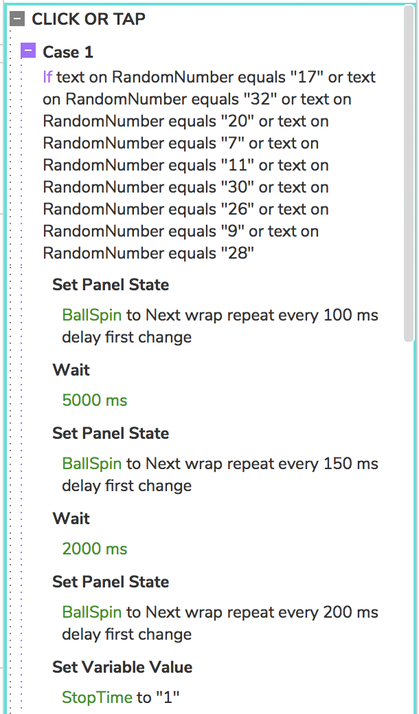 The animation for the ball’s spin is done using a dynamic panel with each state being the next number on the wheel and the animation simply setting the dynamic panel to the next state. When the ball is spun it completes two revolutions, the first at high speed and the second at a slightly slower speed. After that the ball then begins to slow down as it approaches the random number. This is accomplished by a series of actions to increase the animation time as the the ball approaches its section. The wheel is divided into four parts and the actions are timed so that depending on the quadrant the random number is in the ball will slow as it approaches that section.