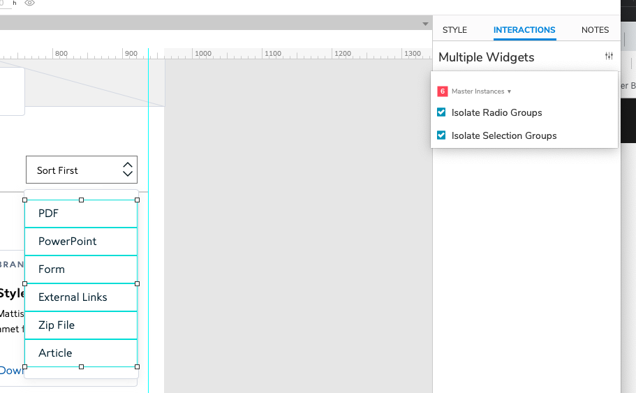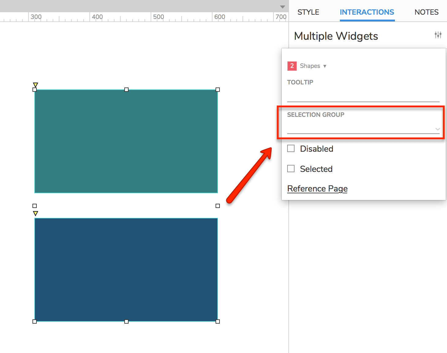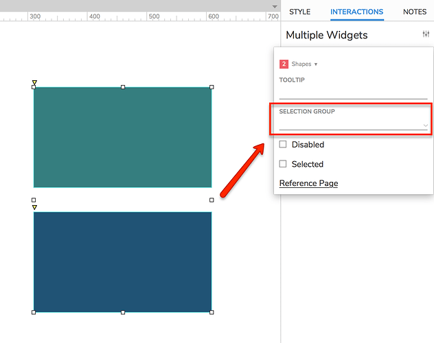 The Selection Group options are available by selecting the widget(s) and clicking on the settings icon in the Interactions tab: