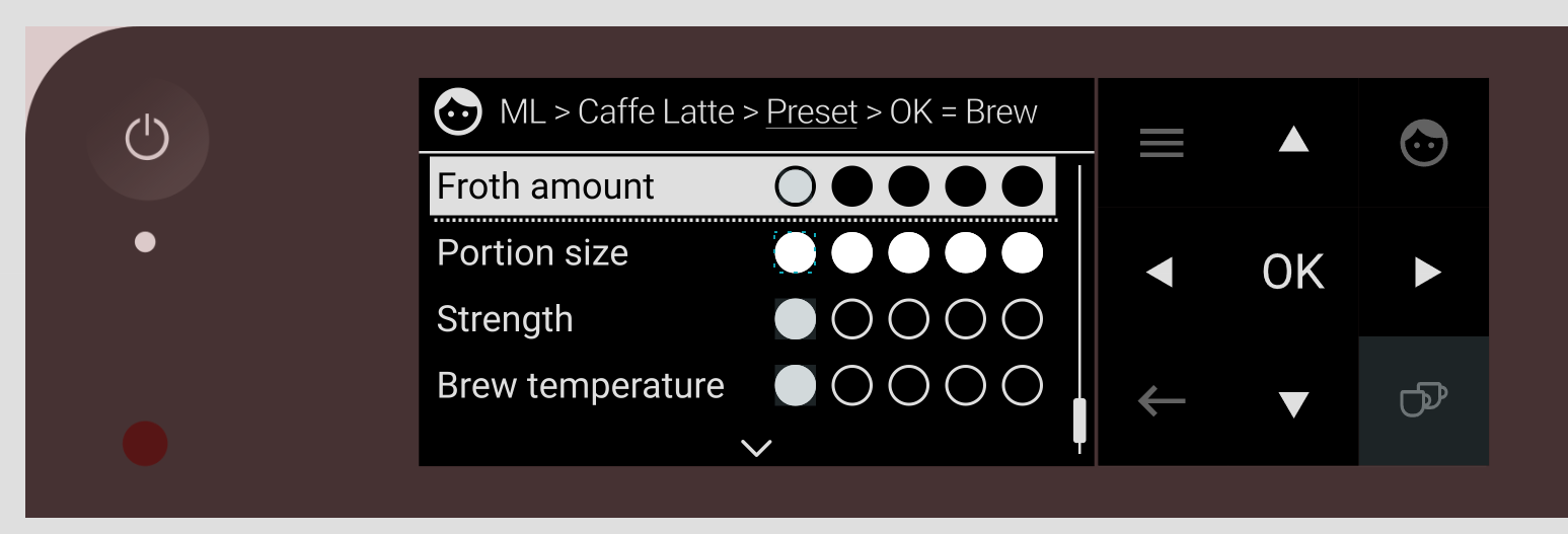 In the machine, you should be able to personalise the parameters of your drink. The idea is that if you press the left or right arrow, 1 to 5 dots are shown/hidden. I did this with 5 different states in dynamic panels. If you then press up or down, you move to the next setting you can adjust. When you move to the next setting, I still want to be able to see the previous adjusted setting if it is in screen.