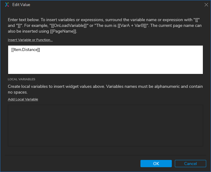 - How to refer to a repeater widget with a Local Variable. Again, click the little fx button to the right of the Value field in this Set Text action. I set this up by clicking the Add Local Variable link, selecting a type of “widget” and then selecting the widget I want to “point to” --which is my repeater. By default, the local variable is named, “LVAR1” so in my expression, [[LVAR1]] is a pointer to my repeater. The “double square brackets” are used to denote this as a logical expression instead of regular text. (This is an important concept to grasp, so