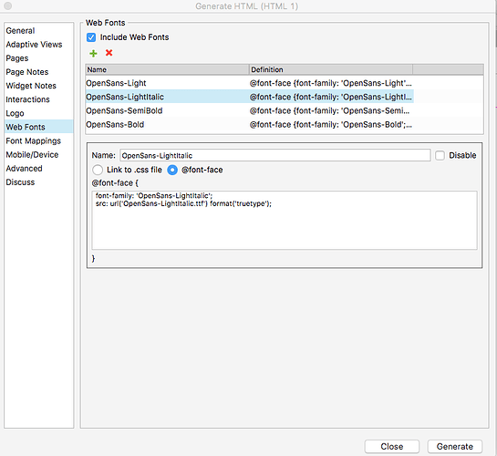 As for Open Sans Light Italic rendering as a serif font, it sounds as if there’s something up with a font mapping either in the Font Mappings tab or in the source font. And are you pointing to fonts that are placed in your local HTML folder? And has Light Italic been added in the same manner as the other weights? Please do elaborate on your font setup and include screenshots along with attaching your RP file. Hope that helps!