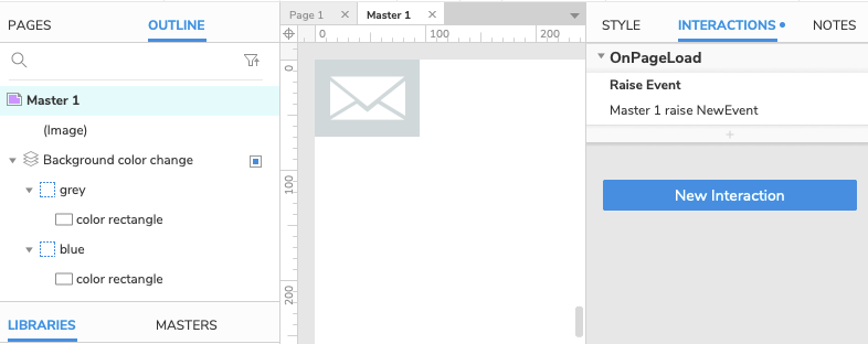 The actions that occur because of this raised event are determined by selecting a master that has been placed on a page. When a master has been placed on a page, you can select the master on the page click “Add Interaction” and the named raised event will display as an option.