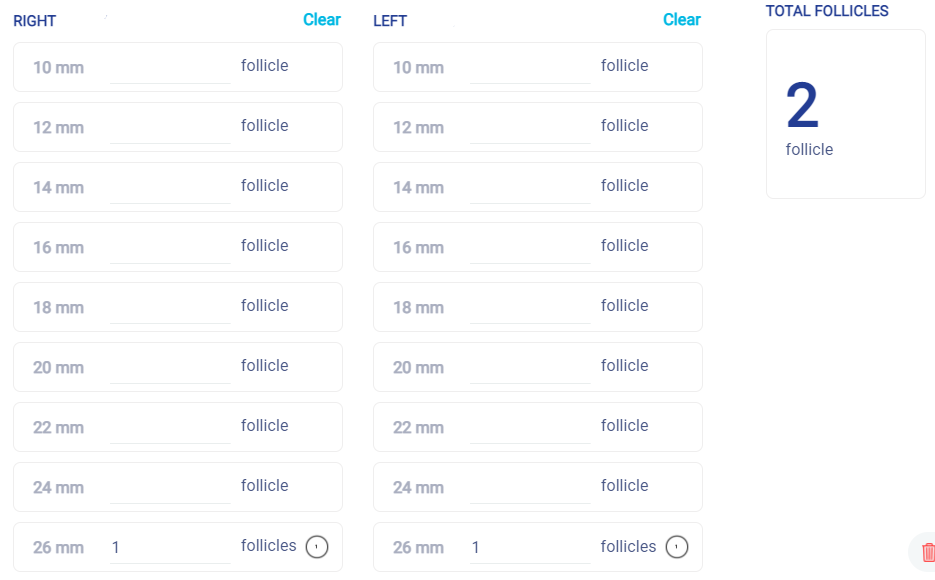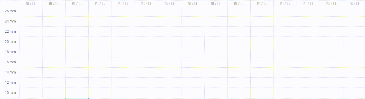 The user will click on one of the cells (based on today’s date) to bring a popup where they can enter details. This popup has 9 rows of input fields (numeric values in millimeters) for each right and left “subcells”. The user can enter a number from 1 to 14 into any of the fields.
